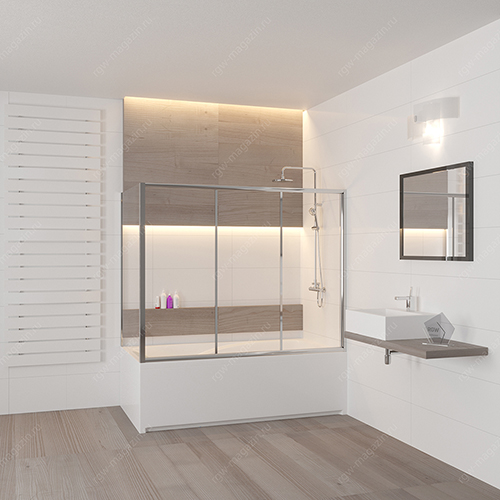 Шторка на ванну раздвижная трехстворчатая с боковым элементом Z-52Стекло закаленное безопасное 4 мм Три полотна стекла два сдвижных и одно неподвижное Регулируемые одинарные ролики Магнитные уплотнители Регулировка модели - 40 + 10 мм Установка открытия двери с левой или правой стороны Профиль анодированный алюминий Цвет профиля - Хром полированный