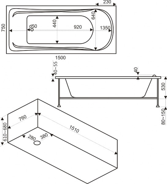 Акриловая ванна BAS (Бас) БРИЗ (ванна+каркас) 1500x750 мм
